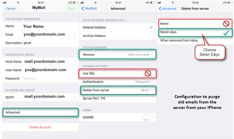 If you ONLY use your iPhone to send & receive mail on this account (not your desktop computer), then you need to configure your iPhone to delete messages after they are downloaded to your phone.  To do this, follow these steps after completing steps 1 - 10 above: